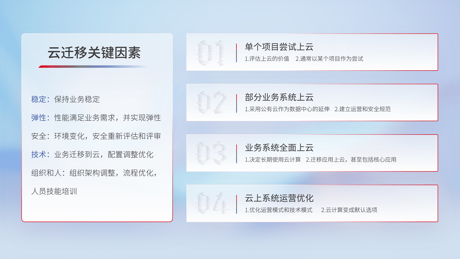 结合实际业务,,,从规划设计、、云平台选型、、、、云原生改造、、、、数据迁移、、、、集成交付,,,,迁移全过程为客户识别最佳上云路径,,,,做好风险识别管理,,,设计网络架构、、、身份权限、、安全审计合规、、操作审计、、、日志审计、、监控告警策略、、多站点容灾设计等,,对云上基础设施进行整体规划,,,,提升IT治理水平,,,以满足弹性、、、高可用、、、高性能的需求。。