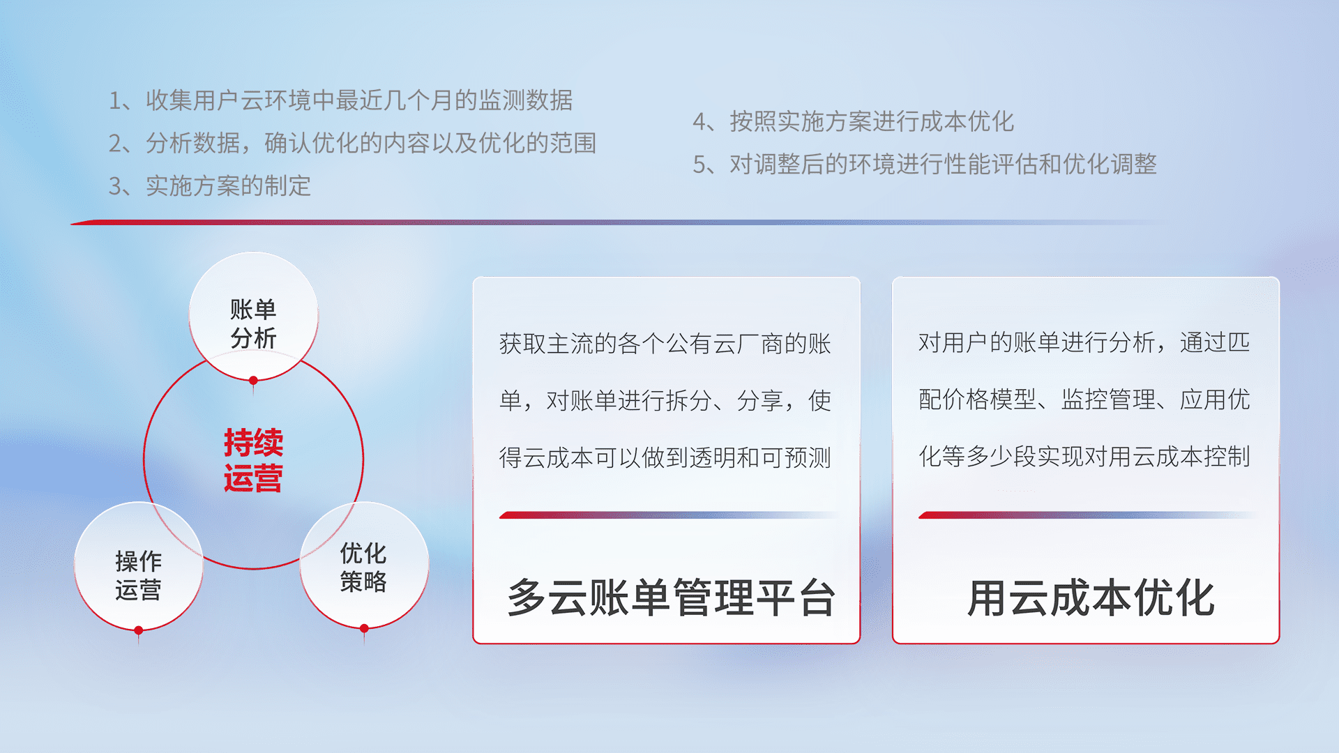 通过多云纳管,,以统一的资源数据模型把客户的云资源进行抽象和封装,,,进而实现对多云资源的统一操作,,保障云资源管理的可靠性、、稳定性与可用性。。量身定制化运维内容,,,,配置、、开发运维、、、补丁管理、、备份、、监控、、、认证和访问管理、、审计和日常巡检等,,,,保障在用云过程中的可靠度,,,稳定度以及高可用率。。。