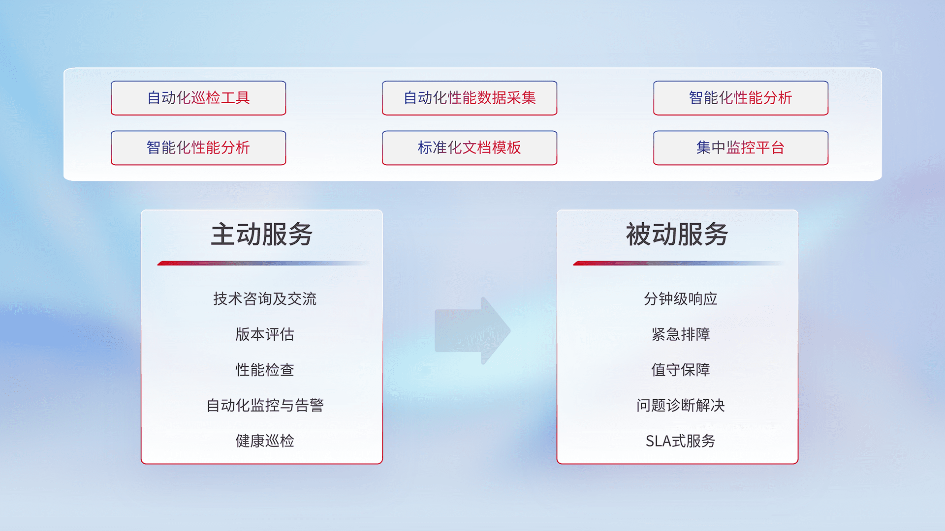 智能化工具和标准化文档,,,,保障服务质量,,,,提供主动服务(包含技术咨询、、版本评估、、性能检查、、、、自动化监控与告警、、、健康巡检)和被动服务包含(分钟级响应、、、紧急排障、、、值守保障、、、问题诊断解决、、、、SLA服务)。。。。