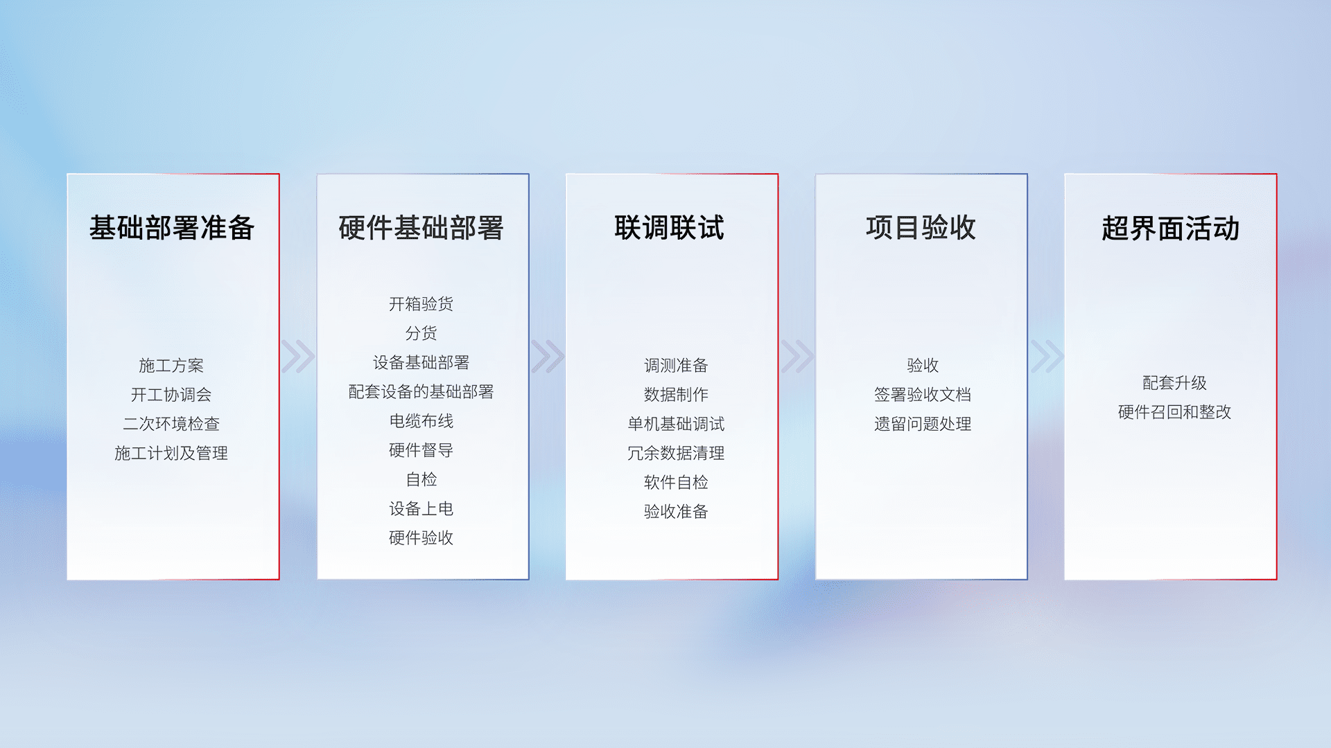 从基础部署准备、、硬件基础部署、、联调联试、、、项目验收、、、越界面活动的全过程可追溯,,,,保证施工质量和进度。。